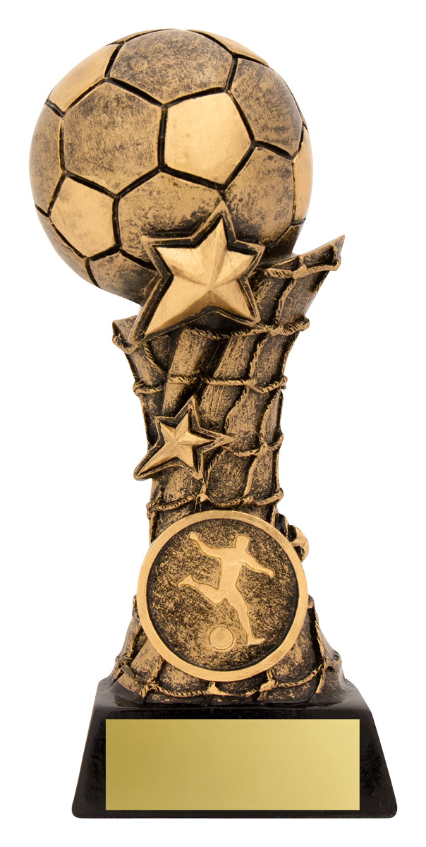 Effective design that showcases the football atop a stylish goal net tower - finished in classic antique gold colours and black base. This design starts at a reasonable price point making this generic theme a great choice for participation awards. Space for insert also present.