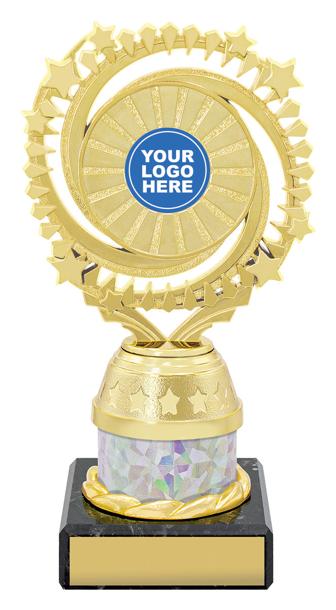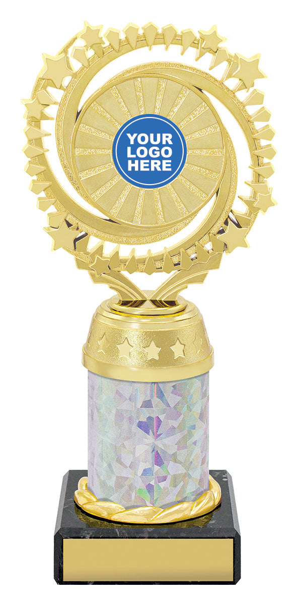 Cosmic series of affordable trophies feature star spangled holder in gold or silver - choose colour of column to suit your order. Suit 25 or 50mm centre insert.