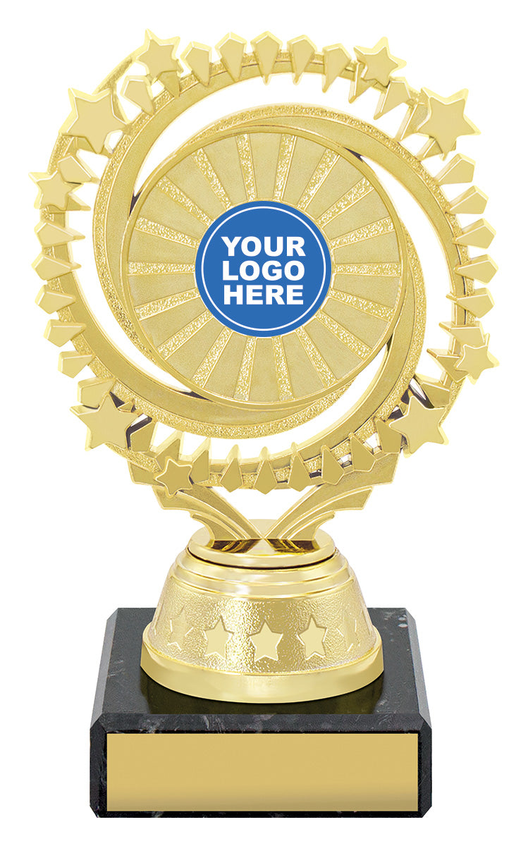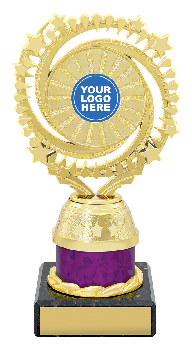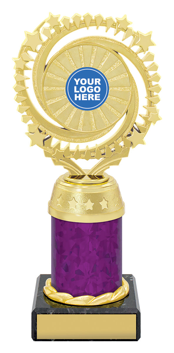 Cosmic series of affordable trophies feature star spangled holder in gold or silver - choose colour of column to suit your order. Suit 25 or 50mm centre insert.