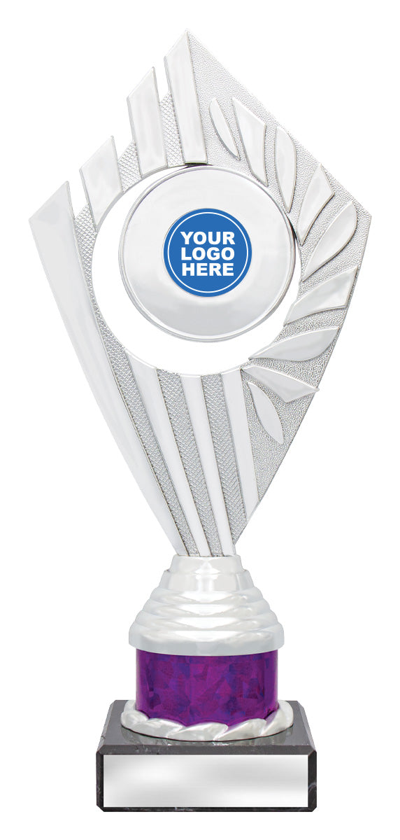Flyer Series of trophies feature beautifully designed holders on columns of different colours - option to showcase 25 or 50mm logo or insert.