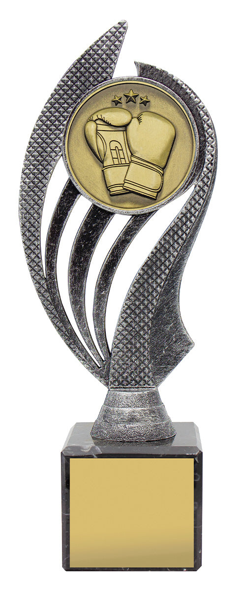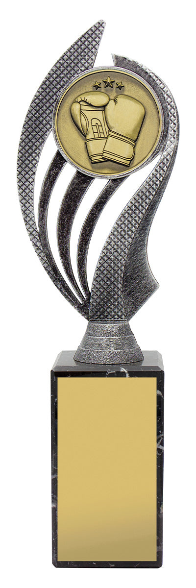 Husky series of trophies on premium black marble allows for different award options for your activity. Appealing antique silver and gold combination over number of sizes.