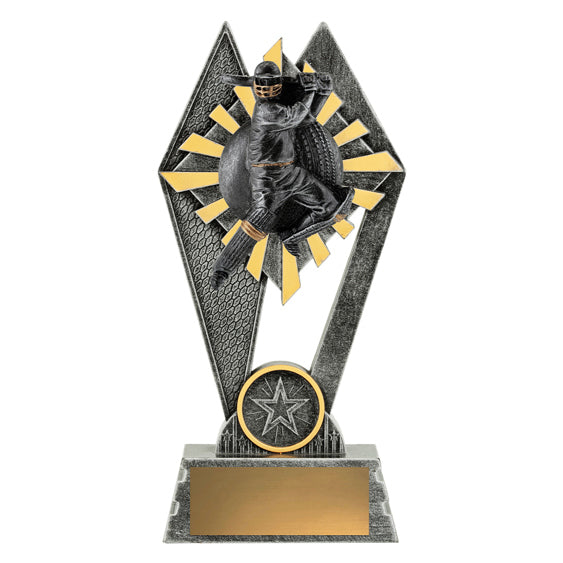The Peak Series - for Cricket - is an innovative trophy series offering super value for such an impressive size range. An elevated design that showcases a male batsman theme against a vibrant sunray style background.