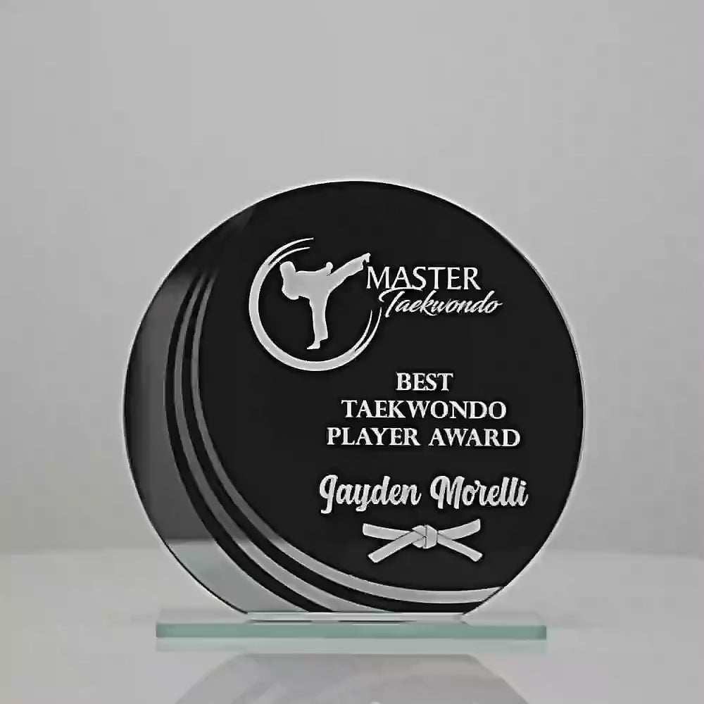The circular Avalon series of budget glass awards will perfectly show of your engraving together with a stylish black & silver design.