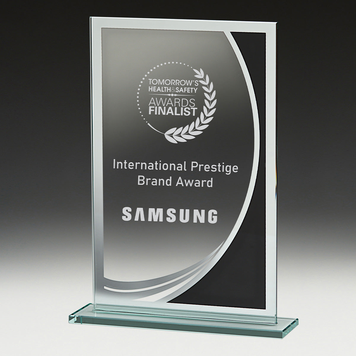 Affordable glass trophies, the Mistral series features a sweeping design that evokes the natural elements. Space for your engraving or custom logo.