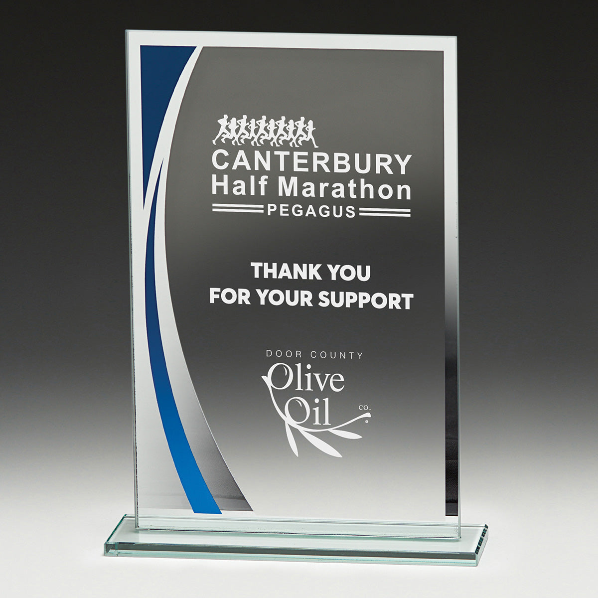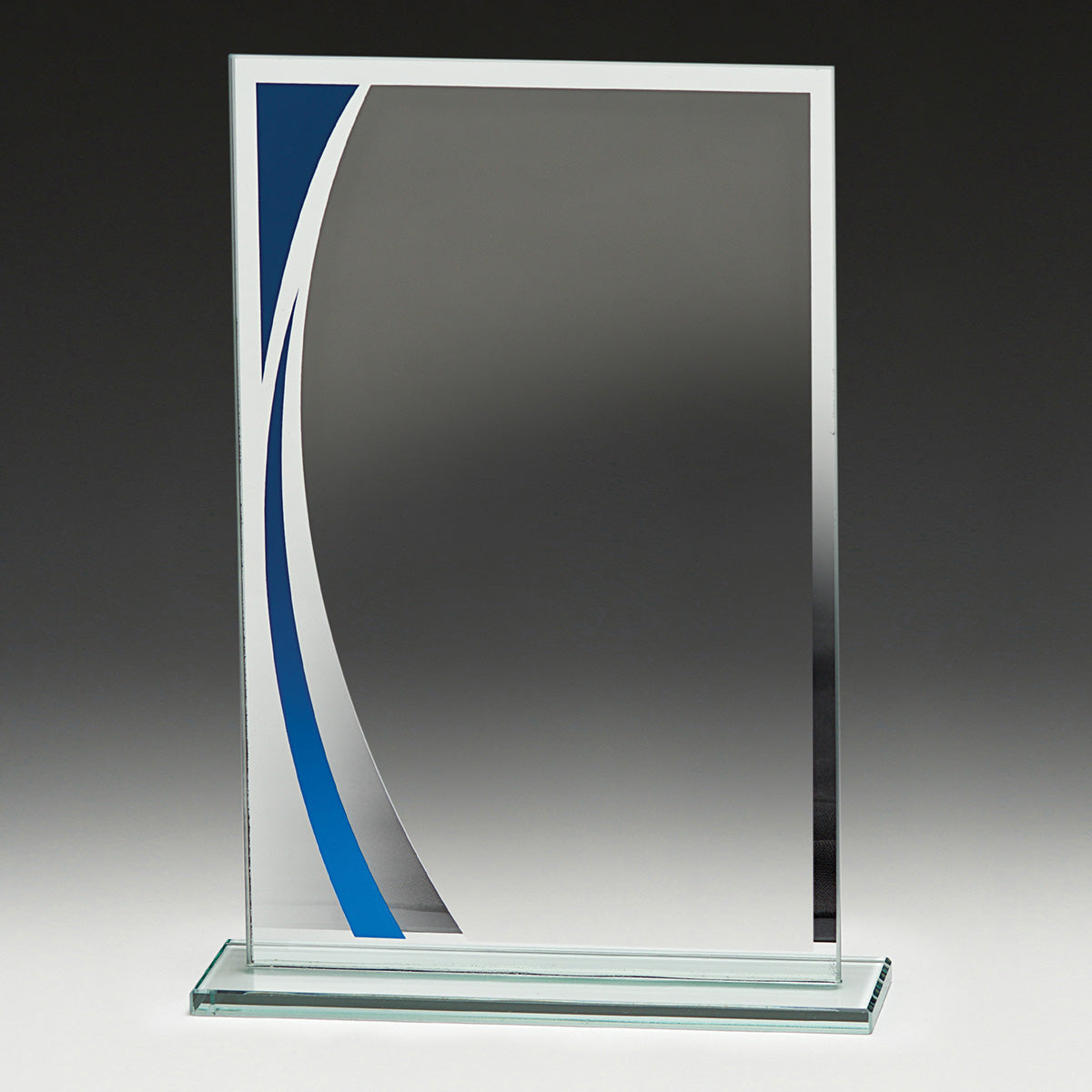 The Coastal Glass award offers a budget friendly option that features eye catching blue and silver highlights to offset your engraving. Available in multiple sizes - with gift box.