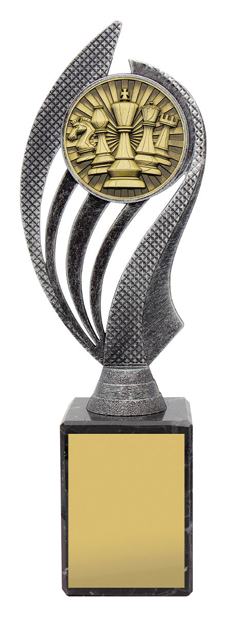 Husky series of trophies on premium black marble allows for different award options for your activity. Appealing antique silver and gold combination over number of sizes.