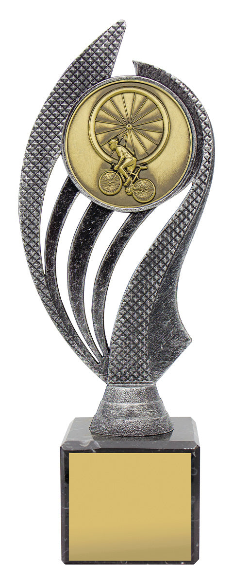 Husky series of trophies on premium black marble allows for different award options for your activity. Appealing antique silver and gold combination over number of sizes.