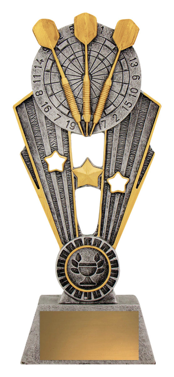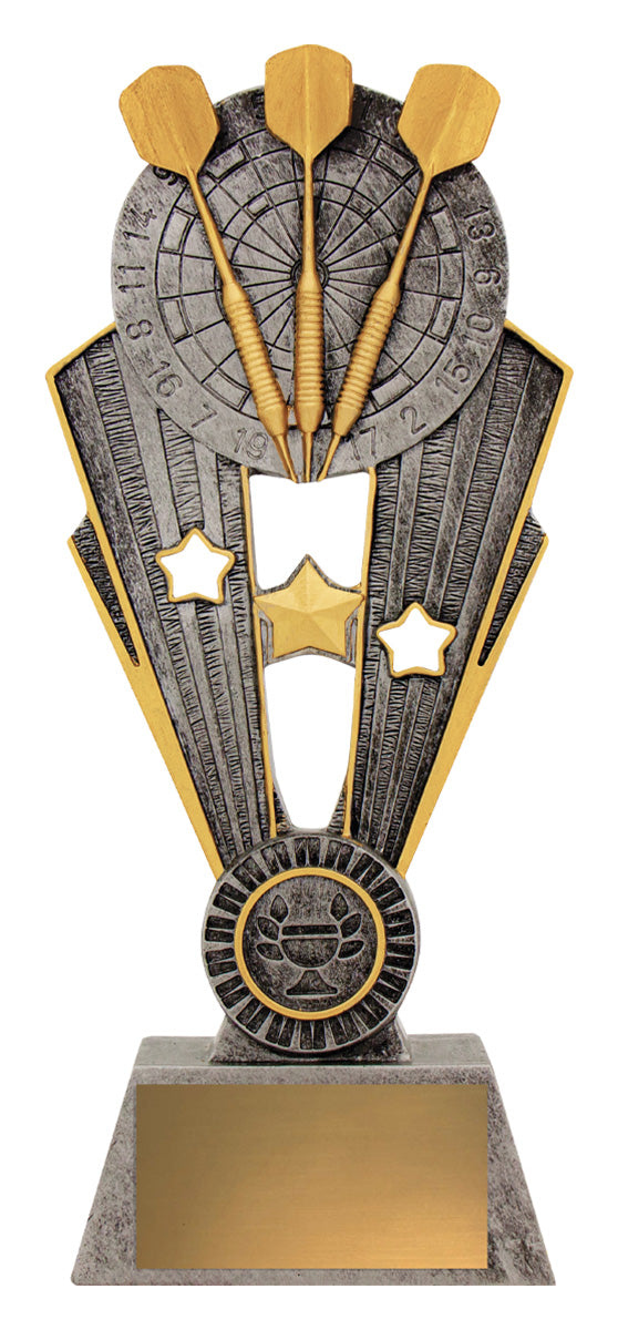 Classic Darts trophy series featuring the iconic darts on board design, finished in traditional silver and gold colours. Ideal for players of all ages, Darts trophies available in 3 convenient sizes, with the space for a 25mm club logo if required.