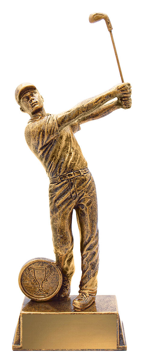 The 'Elite' design of Golf trophies provides male and female versions - golfer captured perfectly mid-swing and finished in classic antique gold. Excellent idea to recognise the achievements of your top performer. Option for customisation.