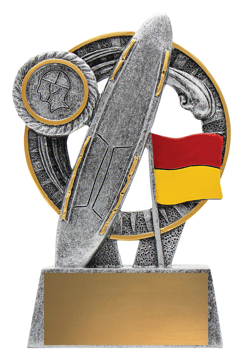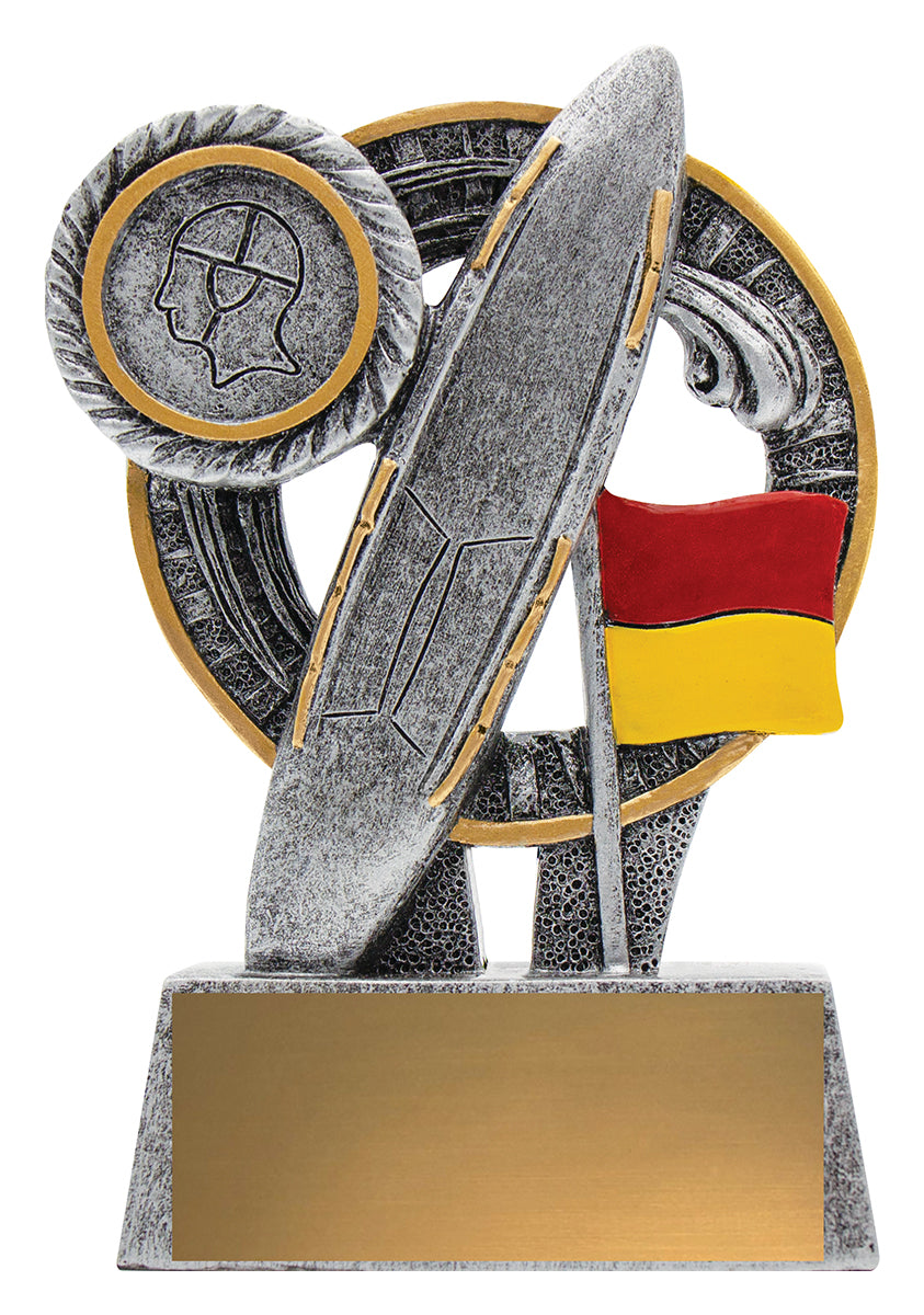 Splendid theme trophy for lifesaving events features board and flag with space for your logo. Series of sizes finished in classic antique silver & gold.