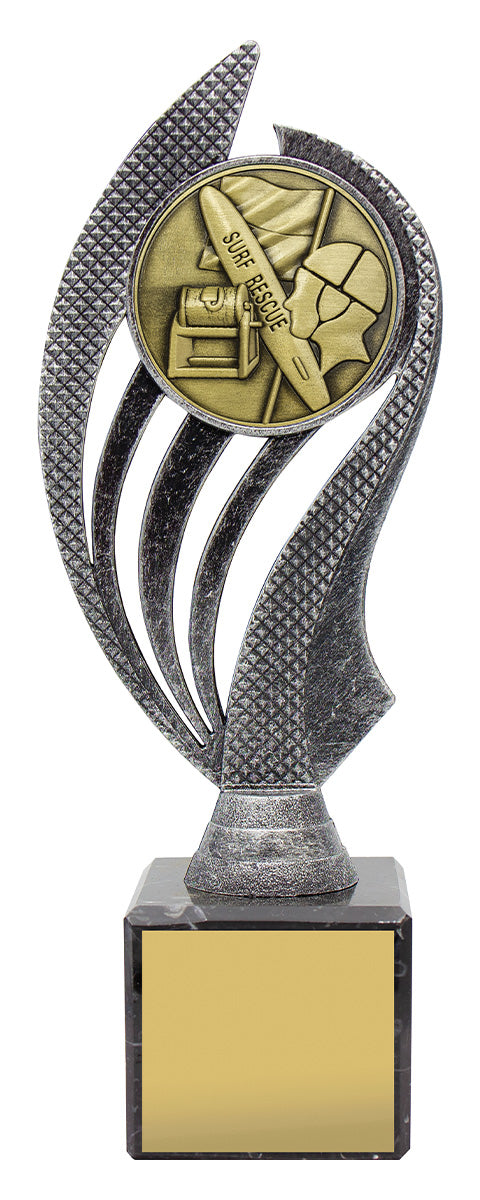 Husky series of trophies on premium black marble allows for different award options for your activity. Appealing antique silver and gold combination over number of sizes.