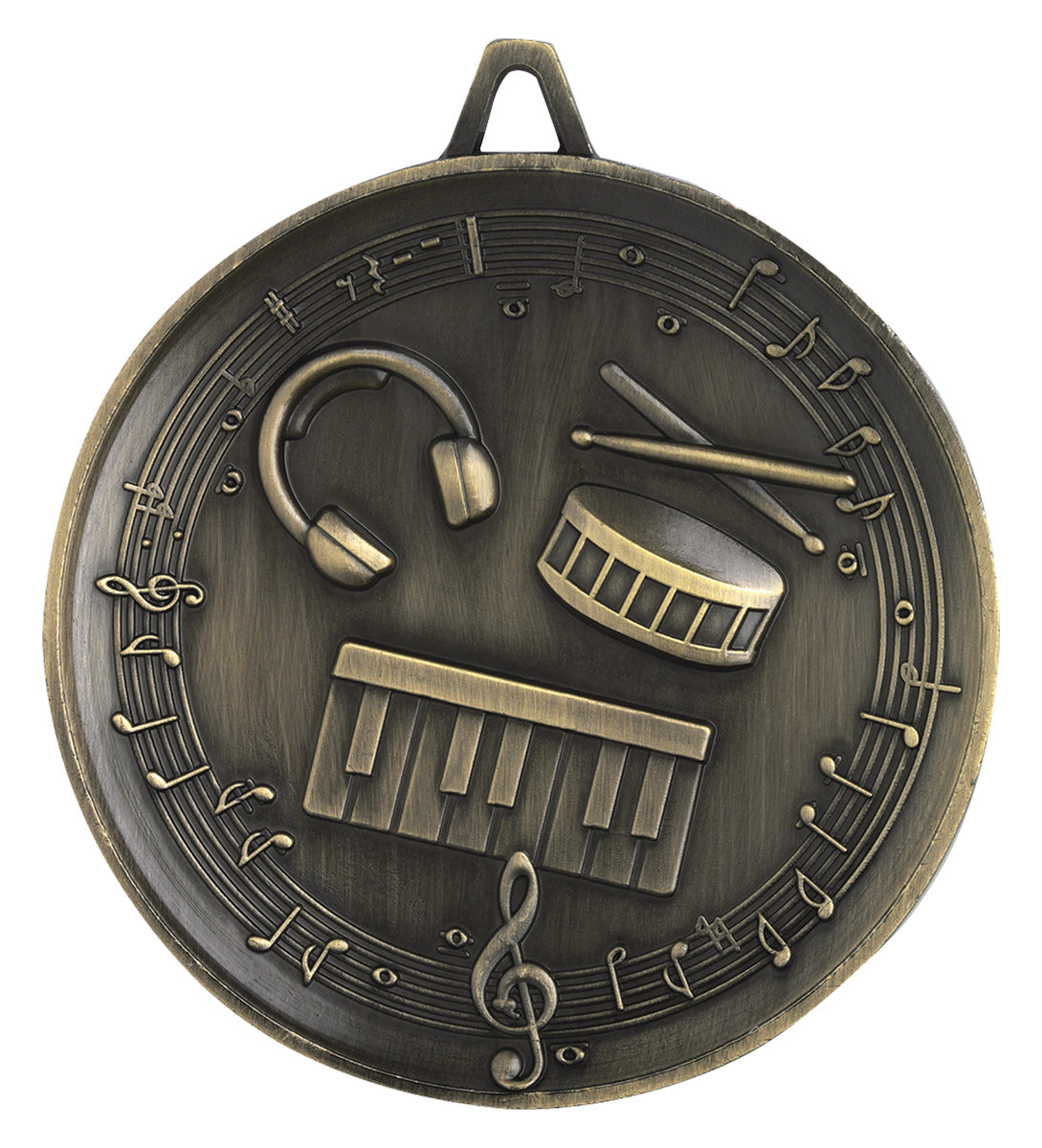 The Budget Heavyweight series offers prestige antique gold medals for a range of sports and activities at great value. The Music medal features a vibrant design that involves key instruments and music note pattern.
