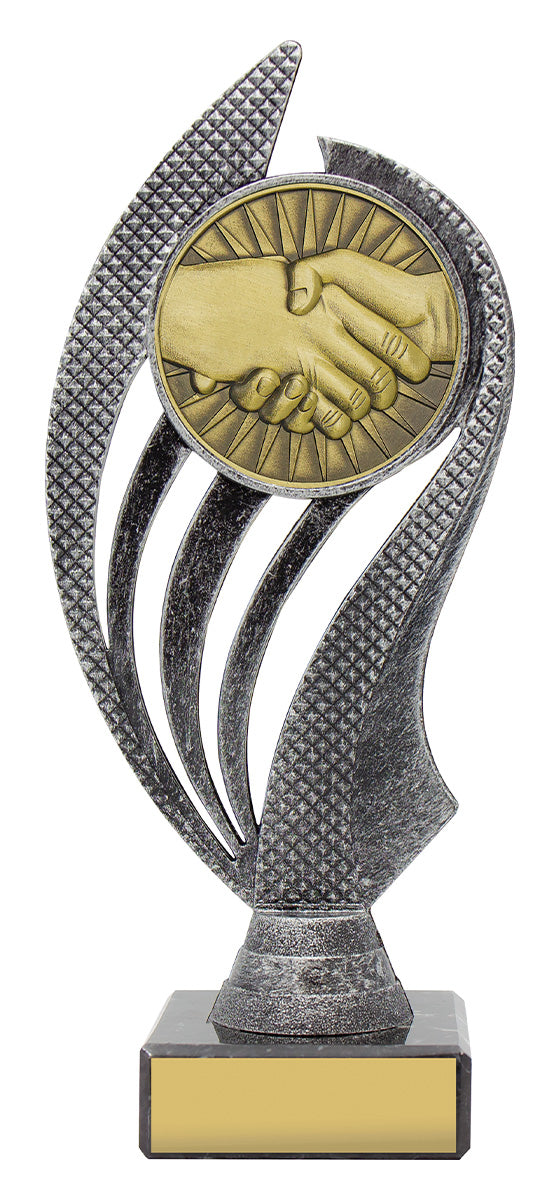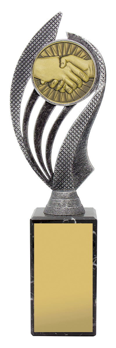 Husky series of trophies on premium black marble allows for different award options for your activity. Appealing antique silver and gold combination over number of sizes.