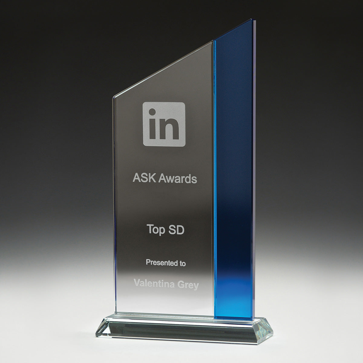 The Blue Zenith Glass Award in 2 sizes - affordable award series supplied in presentation gift boxes. Glass trophies feature blue vertical panels to offset engraving and elevate the effect of the awards. Part of the extensive range of glass awards and trophies available.