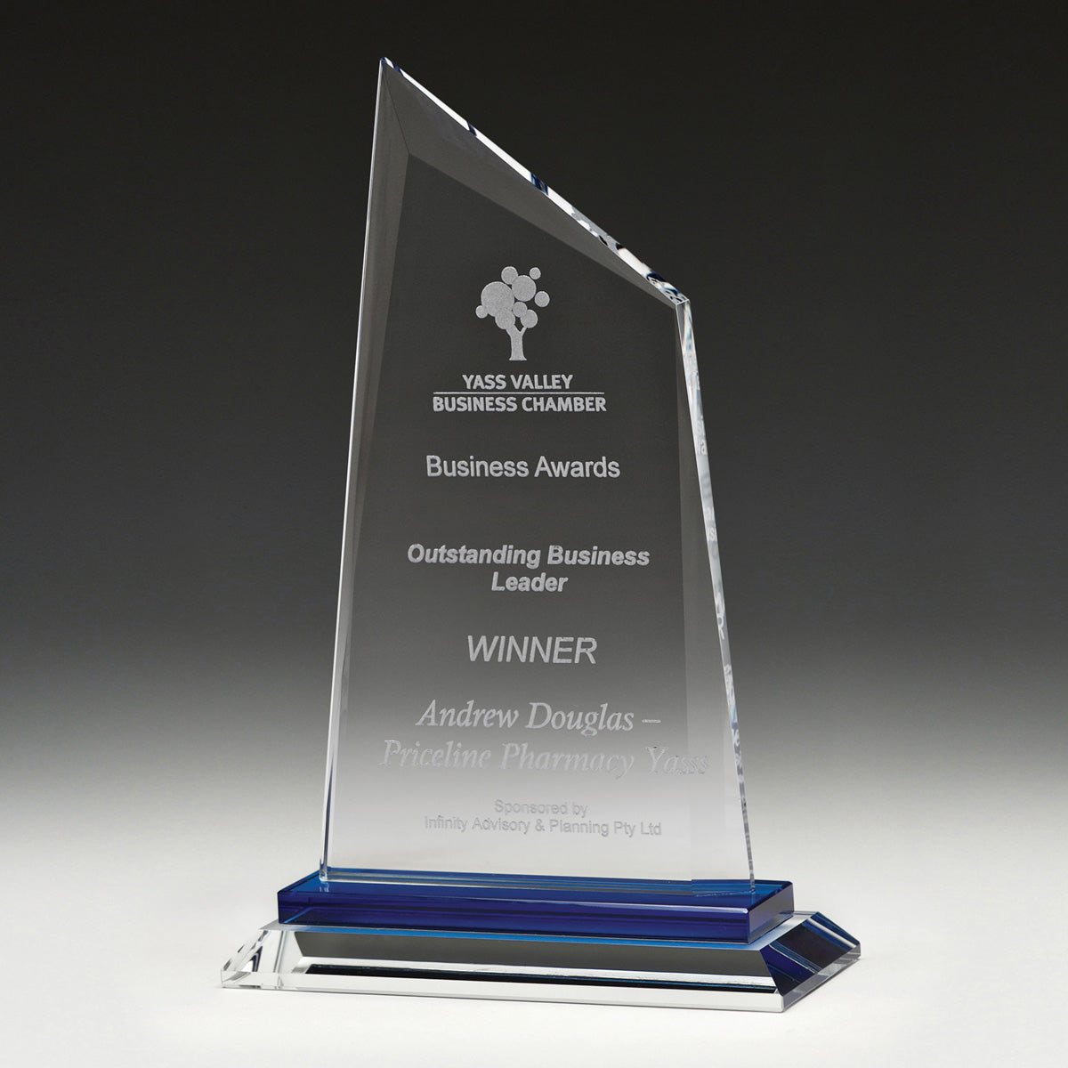 With a classic blue glass accent, this Peak inspired style award is the perfect choice to recognise the efforts of your top performers. Not limited to corporate or business, the Eternity Peak Award can be used for a range of areas to acknowledge achievement and success. Supplied in presentation gift boxes.