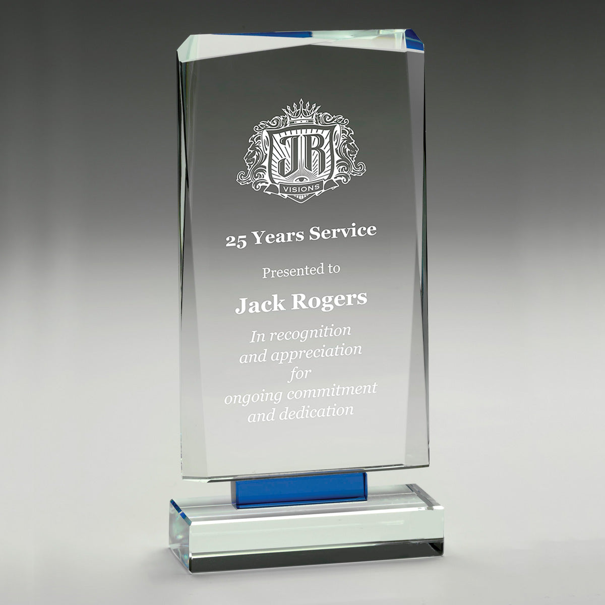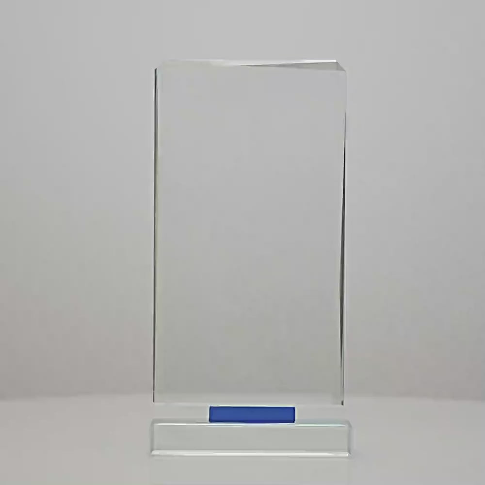 A cool faceted design to show off your engraving, the Blue Mirage Series is elevated by a blue offset base. Quality glass awards are available in 3 sizes - in a presentation gift box - suited for corporate awards and trophies appropriate given the brand or logo of your organisation.